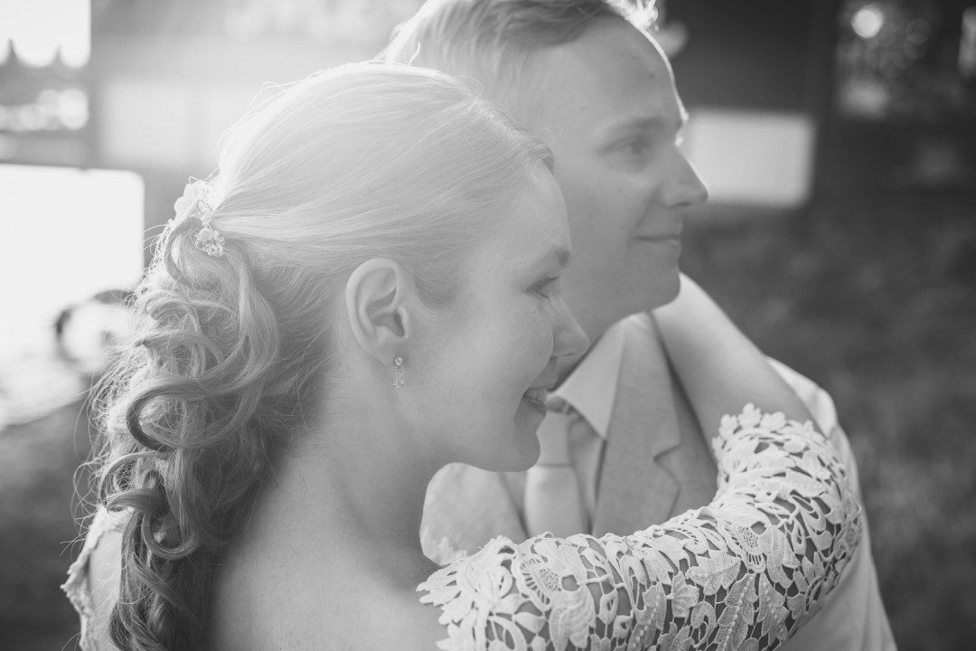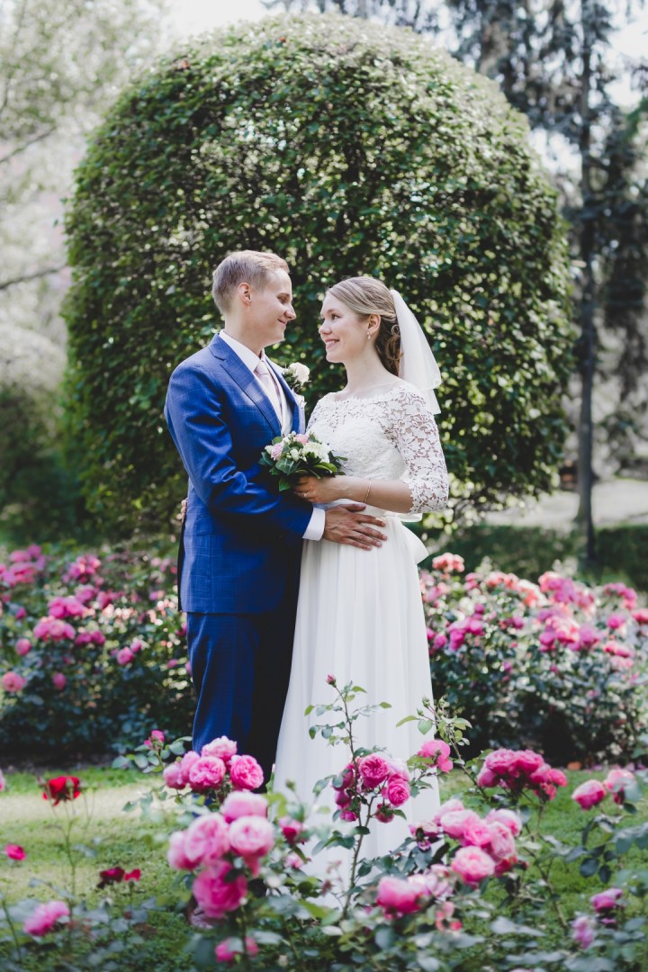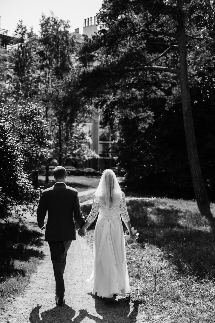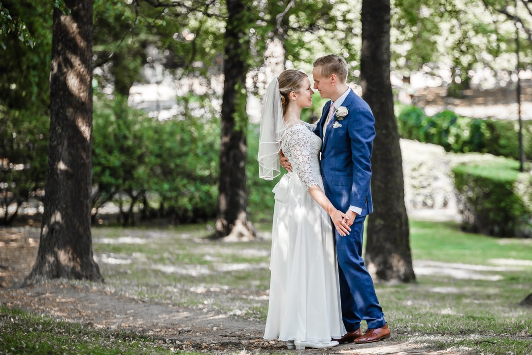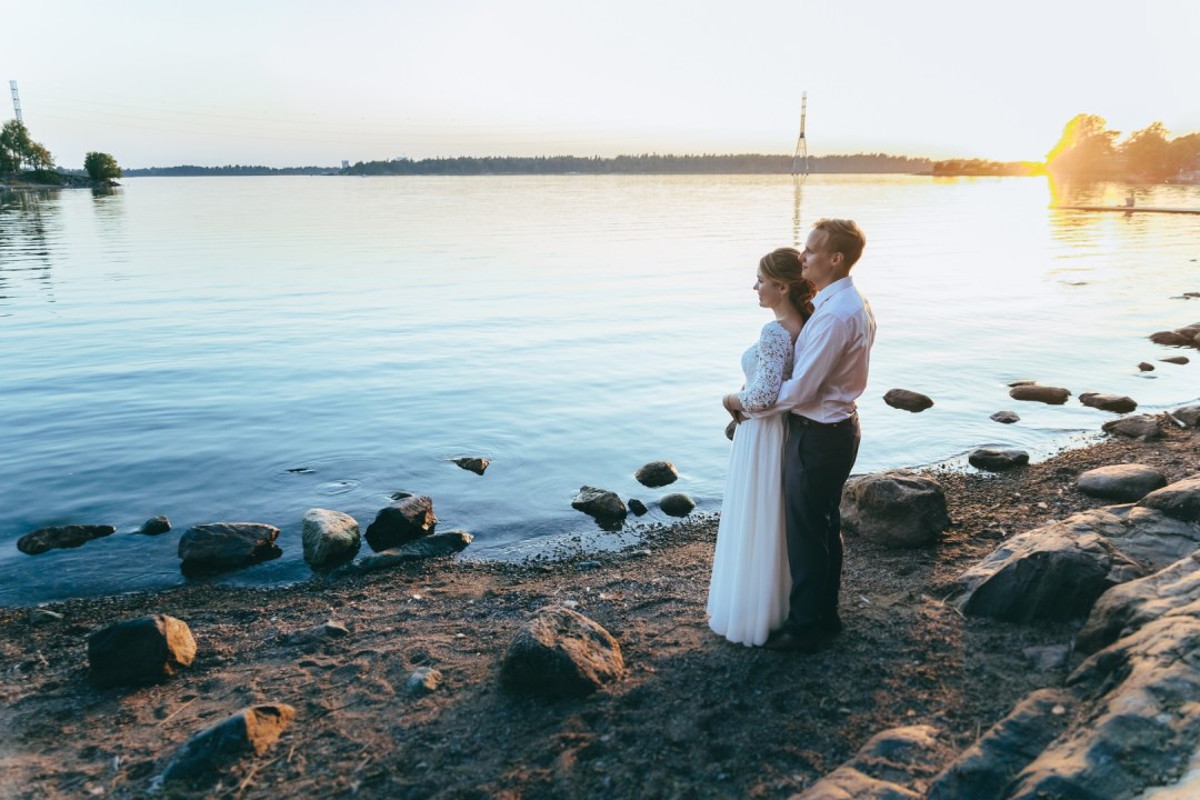Hääpotrettisessio alkoi vihkimisen jälkeen Töölön kirkon vieressä sijaitsevassa puistossa, sitten myöhemmin jatkettiin Mestaritallin rannoilla. Tähän mennessä harvoin tuli mahdollisuus kuvata auringonlaskun aikana, joten oli ihana saada mukaan auringonlaskun värimaailmat ja tunnelmat kuviin.