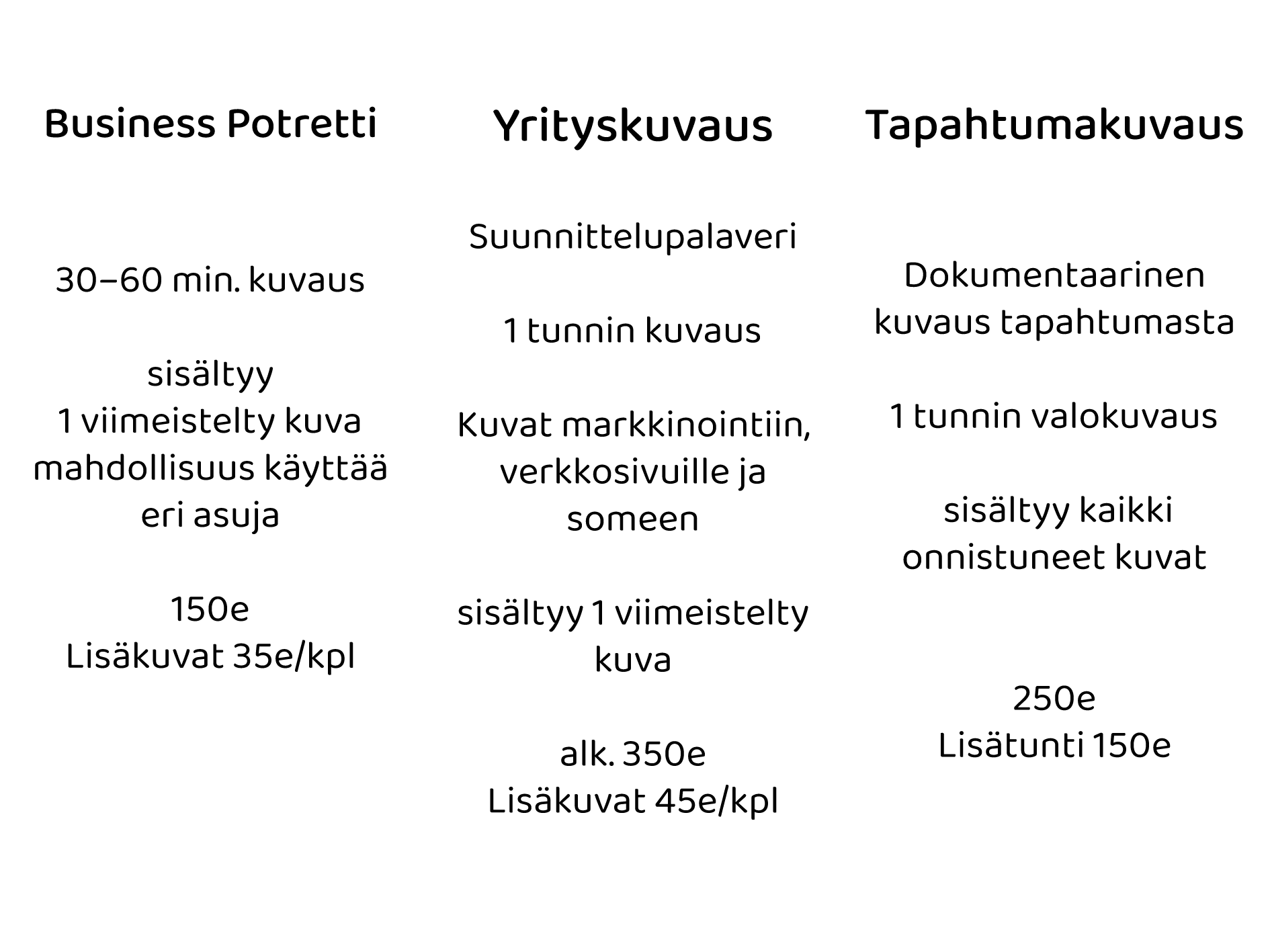 Hinnat sisältävät huolellisen kuvankäsittelyn sekä laajat käyttöoikeudet.